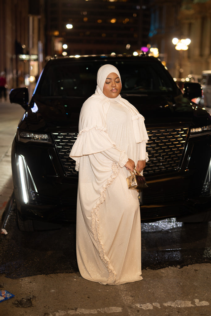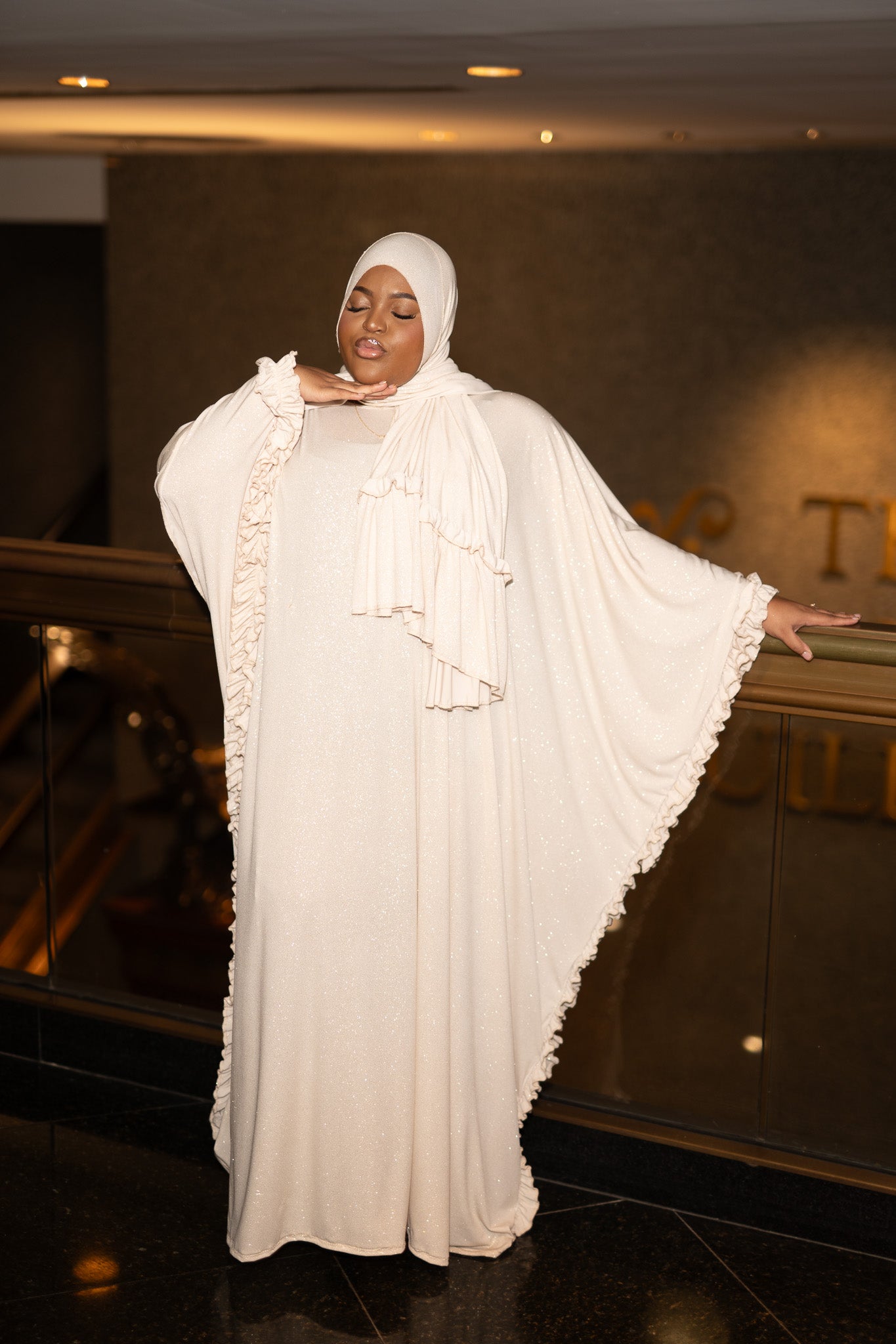 This stunning abaya is perfect for any occasion in which YOU are the star! From anniversaries, walimahs, to nikkahs this look is the one to turn heads! Shimmery detailing that is perfect in all lighting. Set includes ruffles kaftan and ruffle shayla. The fabric used is glitter ITY, very lightweight and comfortable.